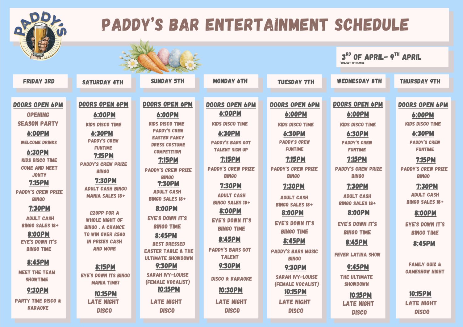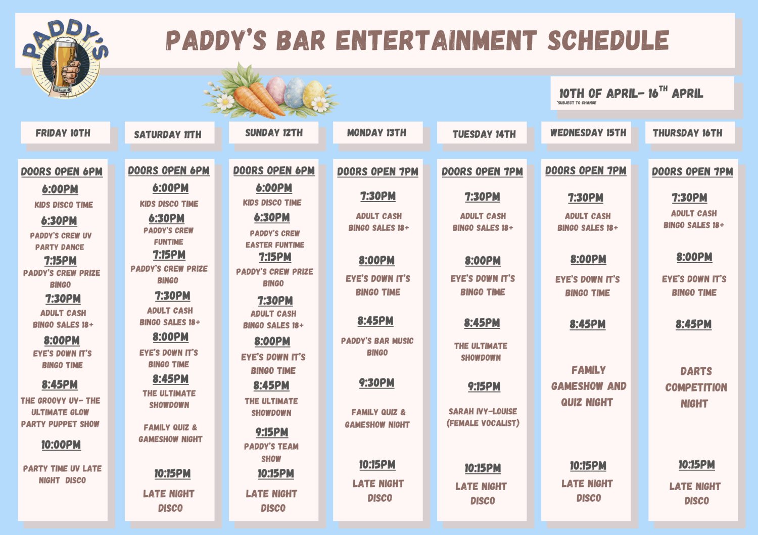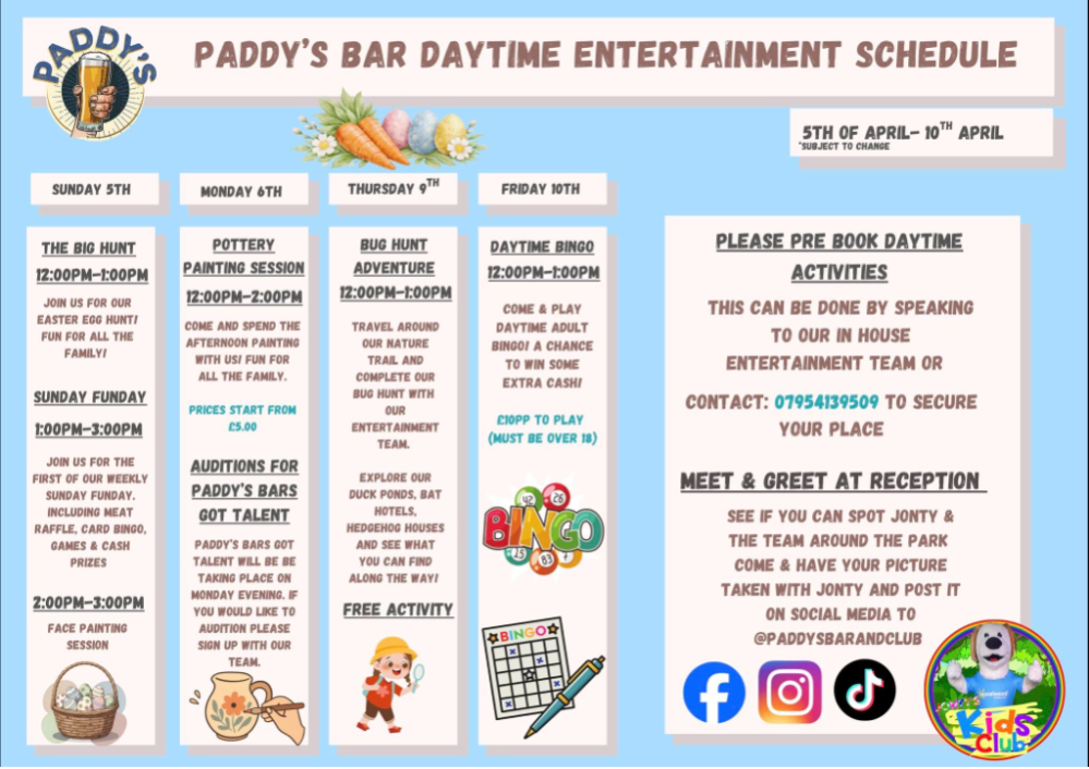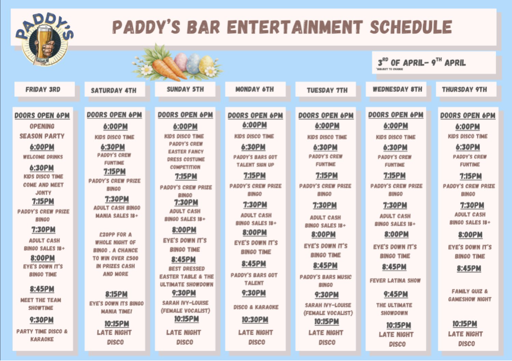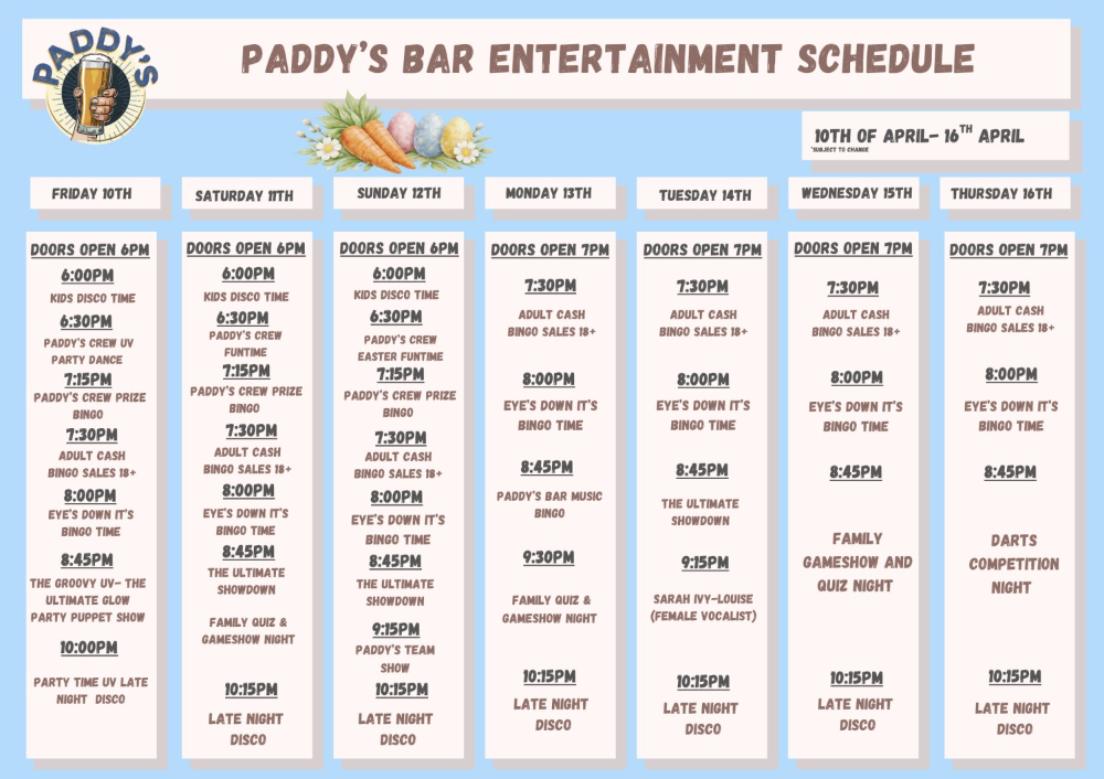 Expect to find all the information you need during your stay on our facebook page @PaddysBarAndClub